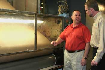 I also learned that these Ali boys are a resourceful lot. Frank and his sons literally designed and built, the colossus of a machine that manufactures their Gator Finishing Products. They call it, ominously, “The Maker,” and it has to be at least a football field long. If you’ve ever seen a continuous-feed web printing press in operation, you’d get the gist of how “The Maker” churns out sandpaper. Giant rolls of substrate, which can be either paper or cloth, feed into one end of the machine. It applies resin and a layer of grit (technically called grains), bakes it one or more times depending on the product, and then rolls up the completed bulk sandpaper on the other end. An electrostatic charge draws the grains up onto the glue-wetted substrate like a magnet. Unlike a gravity-based process, which would lay down the grains more or less randomly, a static current ensures that the largest flat facets of the grains end up glued to the paper. That way, their pointed tips face out. It’s an important detail that improves the abrasive longevity and performance.