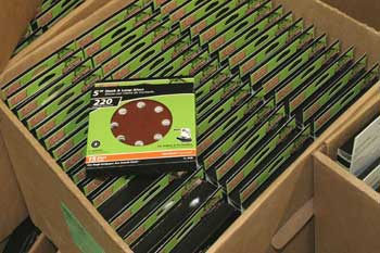 From there, the sandpaper receives pressure-sensitive adhesive and either backing paper or a layer of fabric for hook-and-loop use. Sometimes the rolls are fed through another machine that bends the sheet several times to improve its flexibility. Then the sandpaper is die-cut into sheets, discs or belts before it’s packed up and shipped out to hardware stores and home centers. I was able to see the entire manufacturing process walking the building from one end to the other.