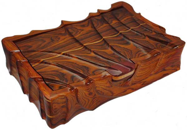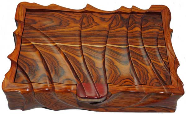 I have been fascinated with angle grinder sculpting and have designed and created numerous projects in an effort to create a unique style of my own. This is a recent box sculpted from Cocobolo. Additionally, I added a few maple and bloodwood accents.