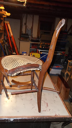 I am a permanently disabled veteran so I can not have an income, so I repair antique wood furniture for fun. I have been doing this for more than 40 years. I do the repair for only the materials that I use. Many time people bring me things that, to them, seem unrepairable. In this case, a lady brought me an antique wicker chair that a cleaning lady had stood in and it collapsed. She brought it to me in a box in the trunk of her car. I told her that I could work on the wood but that I was not experienced in wicker, but I gave her the contact information of a guy who had a good reputation that was in the upholstery business. I took it one set at a time and reassembled it one piece at a time.