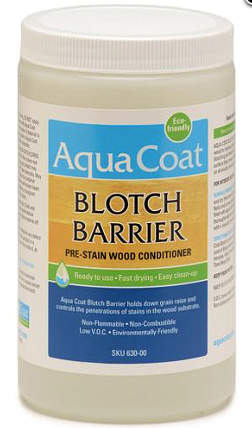 One common criticism of water-based stain is its tendency to raise the wood grain during application, which then requires additional sanding. Barry says those annoying grain-raising issues can be minimized by using Aqua Coat’s water-based Blotch Barrier before applying stain. And, as its name implies, Blotch Barrier promotes a more uniform penetration of stain on porous hardwoods and softwoods, such as cherry, maple, poplar and pine.