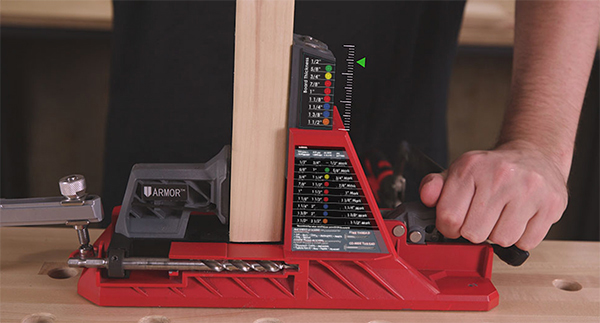 For added convenience, the jig’s workpiece-holding platform on the drill guide enables 2x4s to be used for extension wings, so no special extensions need to be made or purchased. Armor also has developed a color-coded system for its pocket-hole screws. When the jig self-calibrates for use, the correct screw color is displayed on the jig for the workpiece thickness and depth being drilled. Choosing the correct screws is a simple matter of matching the screw color to the jig color indicator. This Color-Coat™ technology also provides anticorrosive protection when the screws are used for outdoor applications.
