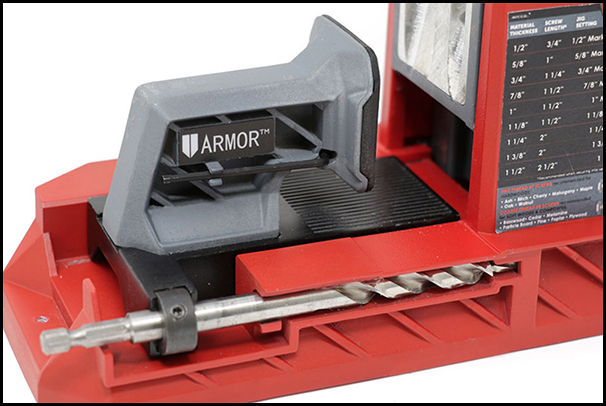 The new Auto-Jig Pocket Hole System from Armor Tool™ is designed to make this setup procedure easier and faster than the competition. The company’s patented Auto-Adjust clamp mechanism, at the heart of this jig, self-adjusts both the drilling guide and the drill bit collar, and these processes take place simultaneously when you insert a workpiece into the jig and tighten the clamp. That convenience eliminates manual setting, measuring and adjusting in preparation for drilling.