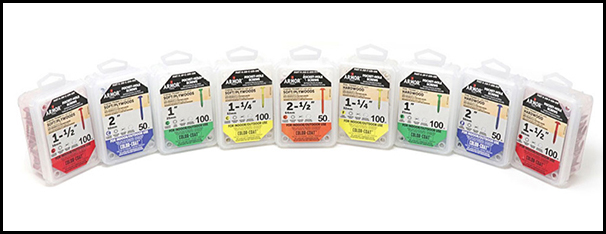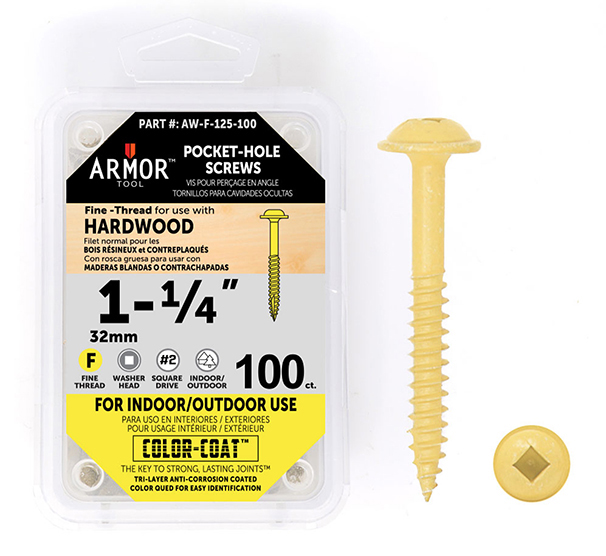 The Auto-Jig Pocket Hole System Project Pack from Armor Tool (item AJPHS-1) will begin to ship this week (anticipated to be Jan. 25) and currently is available for pre-order. It will sell for $149.99. A 750-piece washer head Color-Coat Screw Set is available separately (item A-750-CC-Screw Set; $35.11) and includes quantities of both coarse and fine screw pitches in 1-, 1-1/4-, 1-1/2-, 2- and 2-1/2-in. screw lengths, to suit softwoods or hardwoods. Packages of 100 fine-thread, 1-1/4-in. screws (item AW-F-125-100) can be purchased for $4.69, and 1-1/2-in. fine-thread screws in 100-packs (item AW-F-150-100) are available for $5.19.