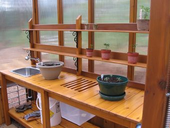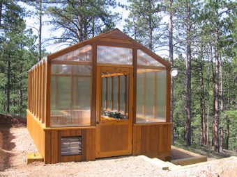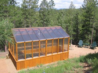 We built a 16′ x 10′ cedar greenhouse in our backyard here in Colorado. We used only cedar, which we stained with Sikkens, as well as stainless steel hardware, 8mm twin wall polycarbonate panels, a 16″ thermostatically controlled fan and a timer controlled soaker system to water the plants when we’re away on summer camping trips. The plant beds are 30″ high around the perimeter of the greenhouse and lined with a rubber roofing material to prevent the inside walls from water damage. The door is also cedar and built using Beadlock joinery with a removable polycarbonate panel for air movement in the summer and to keep the heat in during the early Spring and late Fall. It all sits on a foundation of 6″ x 6″ treated timbers with a natural crushed decomposed granite floor that covers a ¼” mesh grating to prevent moles and voles from digging up into the plant beds. We added a cedar 7′ potting bench complete with a sink and faucet, shelves and a potting grate and bin to catch the dirt.