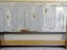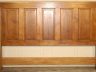 This is a king bed headboard with a formal front & farmhouse back. The piece is an old heart pine door stripped on one side, framed with poplar, stained with MinWax Pecan & clear coated with satin finish.