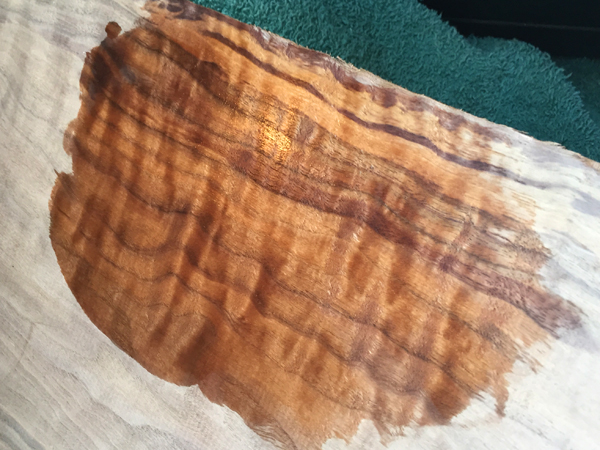I am in the midst of making a sideboard as a wedding gift for my son and his bride. My wife is going to paint the bottom part of the piece an off-white, then use dark antique wax on top of that. For the top, I wanted to get a very attractive piece of wood and apply a natural wood finish to it that would contrast nicely with the bottom. I have chosen to make the top out of highly figured black walnut. The wood is spectacular! My question is, what kind of finish would you recommend I use in to order to bring out the wonderful grain and figuration in this black walnut while also providing adequate protection? The photo, below, is of one of the pieces of black walnut I am using. I spread some alcohol on it to give you an idea of the grain. – Jim Sullivan