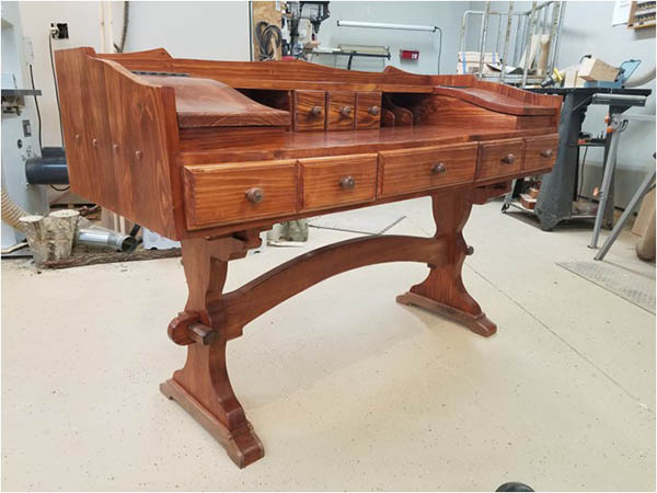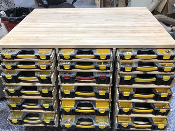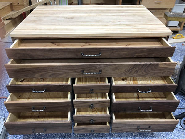“You’re ‘what are you building’ question is pretty timely for me as I have just finished a bench on wheels with yellow box storage. As they say, a picture is worth a thousand words so, without further delay: I built a 1.25-in. edge grain maple top for it. And, in my very best TV infomercial voice: But wait, it’s double-sided. It’s about 37-in. by 57-in. with the top two drawers about 55-in. wide. All drawers are on slides. I used walnut fronts for the drawers on this side. To protect that top, I took two sheets of 1/8-in. hardboard, glued them together and cut it down to the size of the top. Then I sunk a magnet washer into the four corners of the top and embedded 3/4-in. rare-earth magnets into the same spots on the sheet of hardboard so that the cover ‘snaps’ into place when slid onto the top. As a secondary measure of protection, I added a box on one end to hold rolls of kraft paper which can simply be pulled over the top. Good luck on your desk!” – Mark Danner