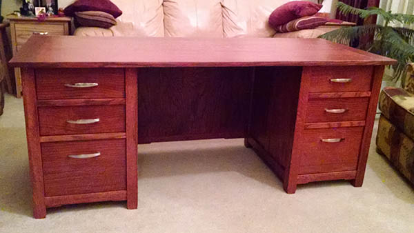 “Constantly flipping between the large and the small. Whether it be the large (I’ve done a desk and a buffet in the past couple of years) to the small (pens, toys, bowls), changing things up helps to keep my skills in practice and doesn’t lock me into one style of woodworking. I’ve attached a picture of a desk I made for my son. The top is 30-in. by 70-in. made of solid quartersawn red oak. The drawer cabinets are a mix of plywood and solid quartersawn red oak with the drawers Baltic birch with quartersawn red oak fronts on full extension slides. The finish is water-based black cherry stain with three coats of General Finishes satin polyurethane (sprayed). The desk disassembles into four parts: top, drawer cases (two) and modesty panel. The plans were for Greene and Greene, but I left out the button elements.” – Ken Weiss