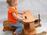 Wings and horizontal tail, oak; fuselage, rockers and decking, poplar; seat, mahogany; hand-carved propeller, 3/4 Baltic Birch plywood; prop spinner/axle is a mushroom-shaped turned scrap of mesquite; engine, pine – painted black. Finished with Watco oil and shellac.