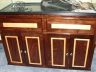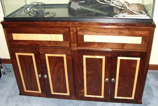 This is a fish tank stand I made for my 75 gallon tank. I used Black Walnut that has been air drying over 40 years and curly Maple. The Walnut/Maple shell is attached to 2×6 pressure sealed wood frame that supports the weight of the tank. I used a Kreg Pocket Hole jig to assembly the shell.