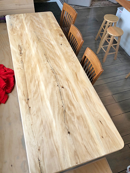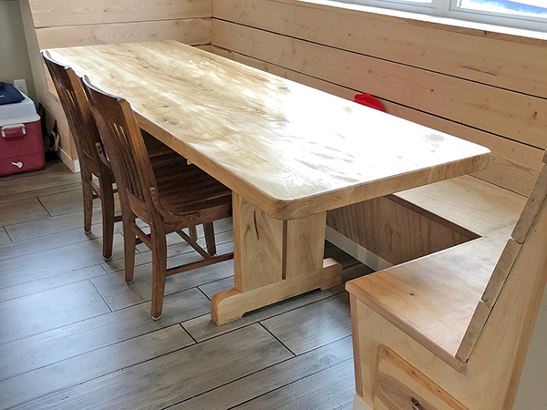 “Your editorial about the piece of salvaged box elder caught my attention. Awesome looking lamp! A few years ago we cleared some trees to make way for a new cabin about an hour north of Minneapolis. A couple of those trees were box elder. I had them milled to 9/4 and I built our kitchen table from it (see photos above). It’s a trestle style, just a shade over 8 ft. long and right at 30-in. wide to fit benches on three sides. My lumber has incredible grain, which seems to have a feathered look to it. My family was pretty excited about how the table turned out (me too)!” – Randy Gatzke