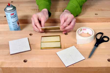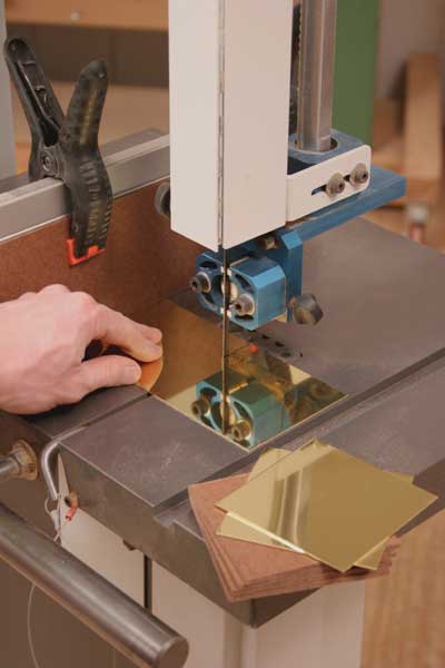 Step 1: Cut three 4 x 4 in. pieces of brass to size. Cut four pieces of 1/8 in.-thick hardboard to match the brass. You can use a table saw or band saw to cut non-ferrous metal safely and without damaging your blade. Make sure your saw’s fence meets the saw table tightly so the metal will not slip underneath it during cutting. Clamp a flat-edged scrap to the fence, if necessary, to cover any gap (see Photo 1).