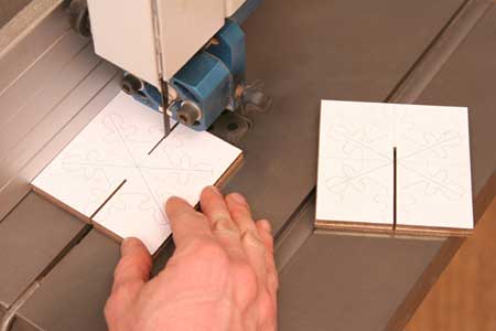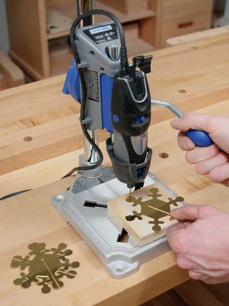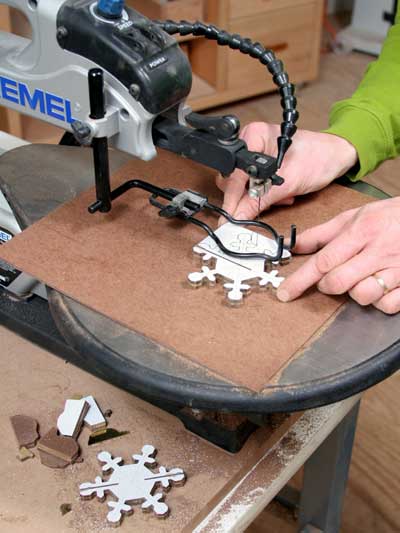 Step 6: Cut the snowflake parts to shape on your scroll saw (see Photo 5). Since you are cutting through hardboard and metal, make sure to have plenty of fresh blades on hand when they dull. Plan on needing at least two blades per pattern. As soon as cutting becomes difficult, switch to a new blade. If your saw has a wide blade opening in the table, you may also want to tape a scrap of hardboard with a small blade hole to the saw. It will help support your workpieces right up to the cut.
