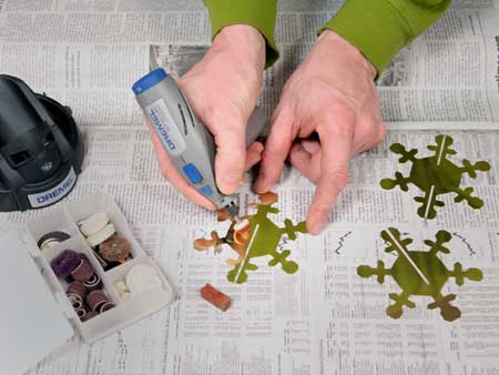 Step 8: Clean up the three brass snowflakes carefully to remove all tape residue. If the metal has any scratches, buff them away with polishing compound and a rotary tool outfitted with a buffing wheel (see Photo 6).