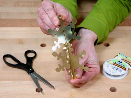 Note: To make this project, you’ll need three 4 x 4 in. pieces of 1/16 in.-thick brass. You may be able to find the sheet metal at a craft store. Another option is to buy a brass kick plate made for entry doors. Most home centers sell these plates. One 8 x 34 in. plate will make four ornaments.