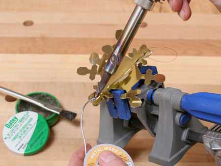 Step 11: Bond the snowflake parts with a few small dots of lead-free metal solder applied near the bottom of the ornament. Make sure to prepare the metal first by brushing paste flux in the solder areas. Heat the metal for a few minutes, holding the tip of the soldering iron against it, then melt the solder to the brass (see Photo 9).
