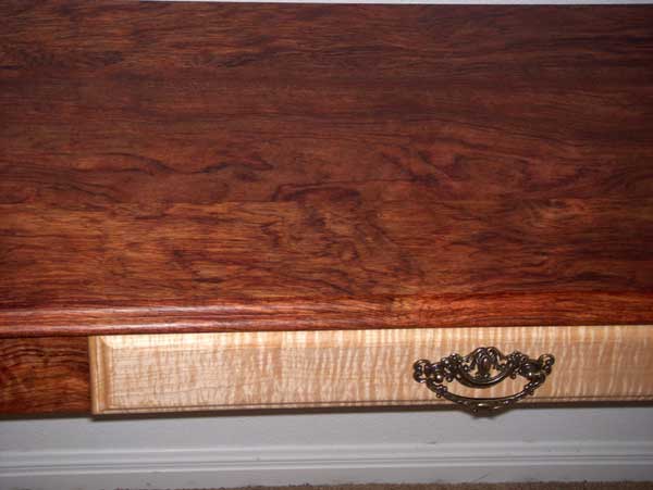 Here’s a desk that I recently made for my wife. I used Bubinga for the desk, Hard Maple for the drawer, and Quilted Maple for the drawer face. I finished it with four coats of a Tung Oil/Lin Seed Oil/Varnish mixture.