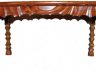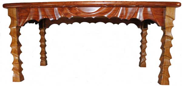 I have been creating a bunch of furniture sculpted with my right angle grinder and knuckle sander. It is a slow and tedious process but I like the results … especially since I try to be a bit different with my creations. The legs are made from salvaged oak and are dovetailed into the aprons, which are made from Bubinga. The top is also Bubinga. The finish is 2 coats of boiled linseed oil followed by 7 coats of hand rubbed poly to create that protective finish that is necessary for a coffee table.