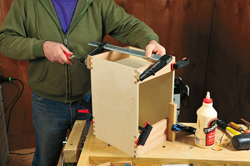 Once all the inside surfaces of the parts were sanded, I assembled the pullout in two stages, first gluing one pair of upper and lower sides to the front, and then the other pair to the back (just make sure to create a symmetrical pair). After clamping,