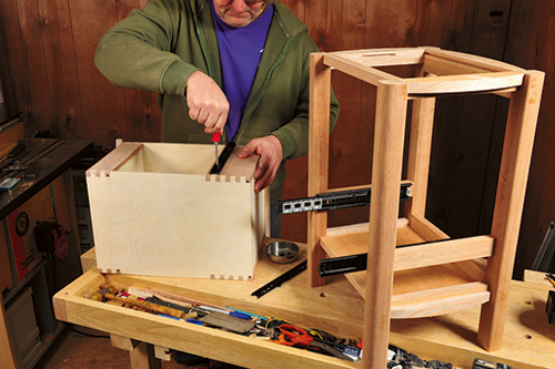 One of the most unusual and practical features of my cabinet is its pullout style drawer that slides on over-travel slides which provide full access to upper and lower compartments. It’s constructed from two pairs of 1/2″-thick solid wood drawer sides joined to a 1/2″ Baltic birch plywood front and back via box joints. I cut the joints with a dado blade in the table saw using a commercial box joint jig, but you can cut them on the router table or with any other shop-made setup you prefer.