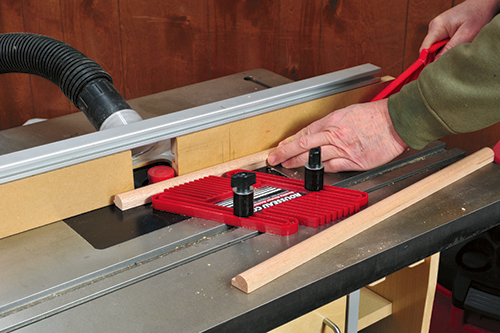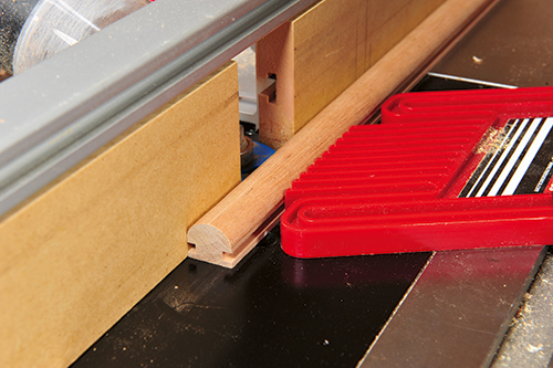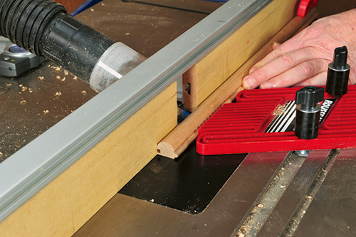 The majority of slats are shaped in three passes on the router table using three separate router bits. The first bit I used is a 3/8″-radius bullnose bit. This creates a half-round shape on the face of the slat. I set the bit’s cutting height so that the bottom of the radius was just flush with the edge of the slat and set the table’s fence flush with the deepest part of the bit’s half-round radius. A featherboard attached to the router table’s miter slot helped keep the stock flat against the fence as I ran the slats through. It’s important to feed each piece of slat stock smoothly and consistently, so the cut surface comes out clean and free of chatter marks; this saves a lot of sanding time later on.