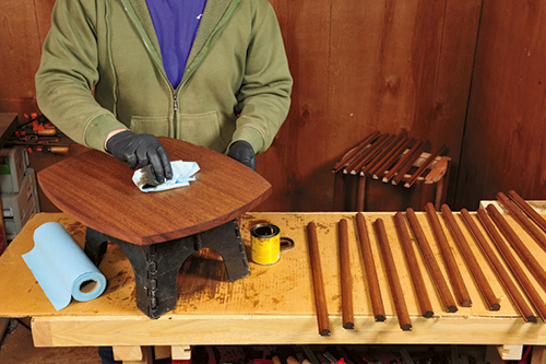 It’s most practical to finish the slats, top, pullout and cabinet frame separately before their final assembly. I sanded all the parts in three stages, using 120- and 180-grit paper and finishing with 240-grit. Since the mahogany I used for the project was so light in color, I decided to stain it with a light brown stain (Minwax® Provincial) to make it look darker and richer.