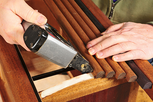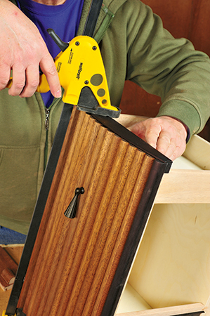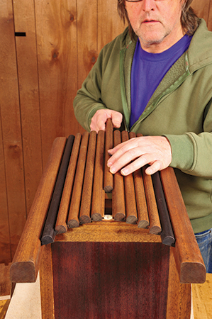 The final steps for completing the cabinet are attaching the slats and fastening the top. With the cabinet lying on a towel on the benchtop, I started by nailing the two ebonized edge strips to the insides of the legs at the back and sides of the cabinet using a pneumatic pin nailer. Then I applied the slats to the sides and back. Doing one curved panel at a time, I spread glue on both curved frame rails, then laid the slats on in order, making sure the top end of each was flush with the top rail.