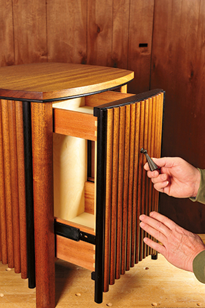 To create the cabinet’s curved sides, I came up with a construction technique that uses half-round slats connected together with tongue-and-groove joints. The joints allow the slats to follow the curved frame rails and let them expand and contract in response to changes in room humidity. Ebonized slats at the outer edges of each curved panel and ebonized trim bordering the underside of the top lend the cabinet a graphic element and a classic Art Deco motif.