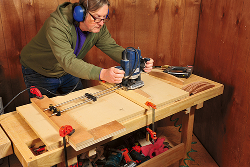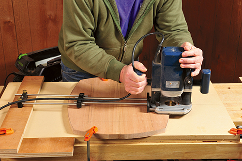 To assure a perfect radius, I used a router jig setup to trim the curved edges to final shape. The setup consists of a plunge router fitted with a 1/2″ spiral-fluted straight bit. It’s important to use a spiral-fluted bit, as part of each cut runs against the wood grain and a straight-fluted bit is likely to cause a lot of tearout. Attach a circle jig to the router’s base (I used a Micro Fence jig, but any circle jig will do). To make radius routing easier, I used an 18″ x 36″ scrap piece of MDF with a centered line drawn down the middle as a base plate. Near one end, I fastened a 3/4″-thick stop strip perpendicular to the line. The rails butt up to the board. I used another 3/4″ scrap with a centered hole drilled to fit the circle jig’s center point as a pivot strip.