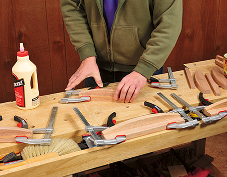 To complete the four side and two back rails, I glued each straight strip to the face of the corresponding rail, with the strip’s edge flush with the rail’s straight edge. The resulting “L” shape provides enough stock thickness for the joinery that attaches the rails to the legs.