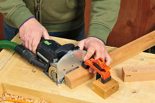 Since I’m lucky enough to own one of Festool’s DF 500 joinery machines, I used Domino loose tenons to join the legs to the side, drawer and back rails. The location of the pieces is shown on the Drawing. Notice that the mortises in the back rails are offset relative to those on the side rails, so they don’t run into each other on the legs. Once I’d marked the centerline of each mortise on the stock, I plunge-cut them in the ends of all the rails. I clamped each rail to my benchtop with its curved edge facing up. A square scrap of plywood clamped next to the rail helps keep the Domino machine square to the ends of the narrow rails. Next, I cut all the corresponding mortises into the inside facing surfaces of the legs, always making sure to keep the leg and Domino machine flat on the benchtop. Note that the two front rails don’t get mortised; these get doweled later on.