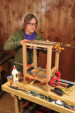 When all was ready, I completed the assembly of the cabinet frame, first gluing the lower front and back rails to the cabinet bottom with plate joinery biscuits. I then applied glue to all the loose tenons and mortises or dowels and holes, and joined the subassemblies together, carefully applying clamps so as not to dent the outer surfaces of the legs or rails. Before leaving the assembly to dry, I checked to make sure all the top rails were flush with the ends of the legs, and that the entire frame was square. I also glued on the two little drawer stop strips to the inside-facing surfaces of the front legs, with their top ends butted up to the underside of the lower front rail.