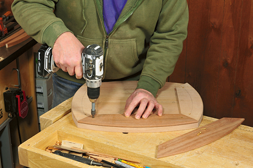 To give the top more thickness and help to better integrate it with the Deco design, I added a trim piece along its lower edge. Four 5/16″-thick pieces make up this trim, each mitered and screwed to the underside of the top to form a frame. To prevent expansion/contraction problems, I cut the two shorter trim pieces with the grain running across the length of the piece, so it runs parallel to the top’s grain. After cutting the parts to rough width, I mitered both ends of each piece at 45°. When assembled, the members should meet with their tips exactly at the junctures of the top’s curves. After rough-cutting the trim’s curved outer edges, I attached them to the underside of the top with small countersunk screws. I then used a spiral-fluted flush-trim bit in a handheld router to trim them flush with the top. After removing the trim pieces, I shaped both sides of each curved edge with a 1/8″-radius roundover bit to form a half-round profile.