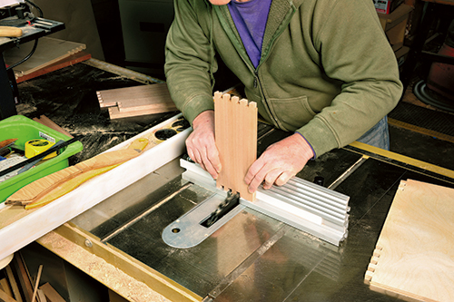 Regardless of the kind of wood the cabinet is built out of, the stock for the slats must be straight-grained and dead flat. If it isn’t, there’ll be problems during the shaping process that likely will result in a lot of twisted, unusable slats. I started by planing the slat stock down to the necessary 11/16″ thickness, then ripped it into 15/16″-wide strips on the table saw. I cut enough stock to make several extra slats, both for test cuts and so that I could discard any slats that weren’t up to snuff.