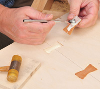 A decorative way to reinforce edge-joined butted parts is with butterfly keys. The hour-glass-shaped key, cut from thin wood, is inlaid into a recess cut into the face of the joint, with the narrowest part of the key centered on the seam between the two parts. When glued into place, the key adds mechanical strength to the joint and keeps it from pulling apart.
