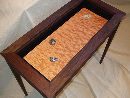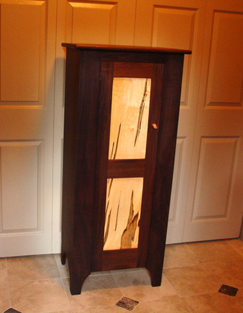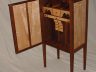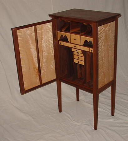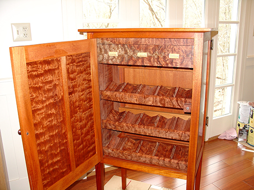 Here are my walnut and maple Shaker cabinet, Sapele wine cabinet, walnut flame maple cabinet with secretary interior, and walnut/quilted maple display (WALT – Walk at Low Tide) table projects.