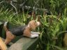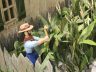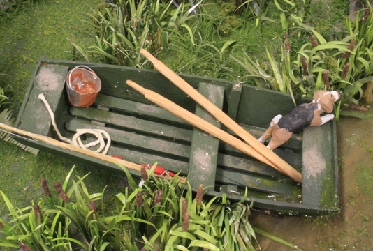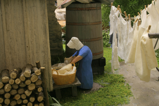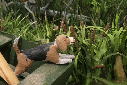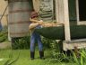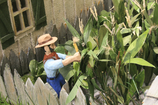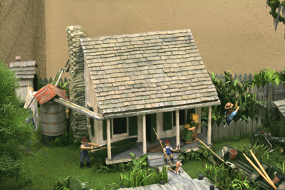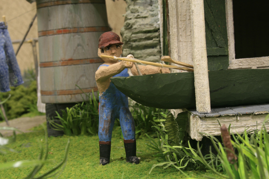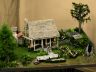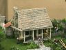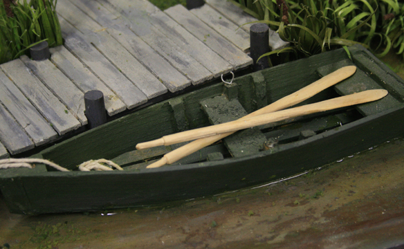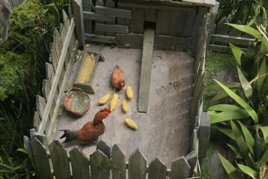 The homestead is built on a 32″ by 40″ base. The cabin, outhouse, chicken pen and fences are made of cedar. The trees and greenery are made of various materials, and the boats are made of cypress.