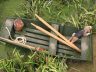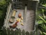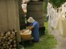 The people, dogs, and chickens are all hand carved out of various types of soft wood.  The people are about 5-6 inches tall while the Beagle dogs are about 2 inches long.
