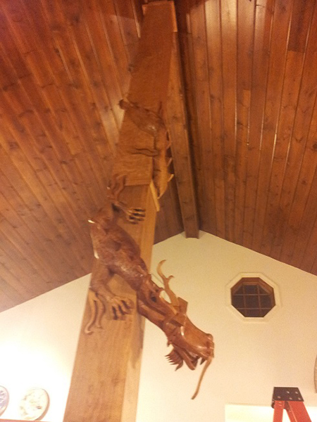 This is a project I did for my wife. She wanted me to cover the main support beam in our living room. I clad it in Cherry wood and then wrapped a hand carved oriental dragon on it.