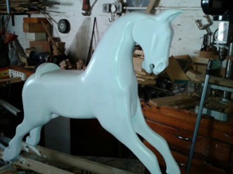 I have always wanted to make a fully carved rocking horse and with the arrival of my first granddaughter two years ago (14 years after the last gandson), I decided that it was time to tackle the project. It took about three months from start to finish and included all the woodwork, making all the tack including the stirrups as I could not get any small ones locally. The body was made from Jelutong with the legs being of beech and the stand in pine. The completed horse was given several coats of gesso and then hand painted and sprayed with water based enamels.