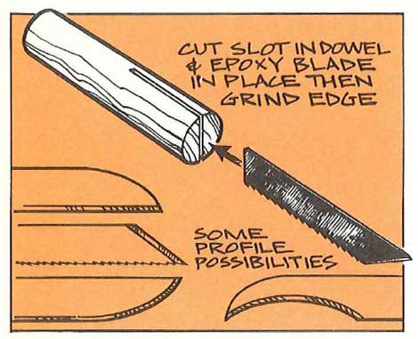 A shop utility knife can be made in just a few minutes using a short length of dowel and an old hack saw blade.