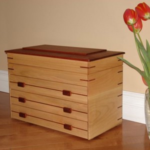 First is a chest that I made with larch and mahogany. I added small wheels that make it easier to move.