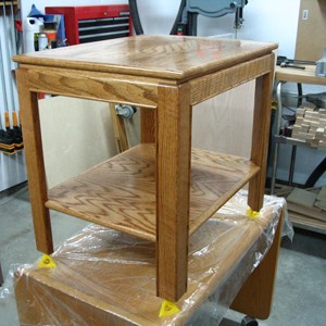 I built these from red oak with oak veneer ply tops and shelves. They are coated with a golden oak stain, and then clear poly with paste wax top coat, all hand rubbed.