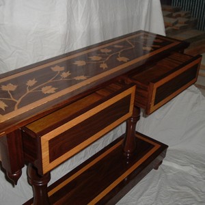 Here are pictures of a Sofa or Console Table made of solid walnut and oak with inlay banding and maple leaves that are a quarter of an inch thick not veneer!