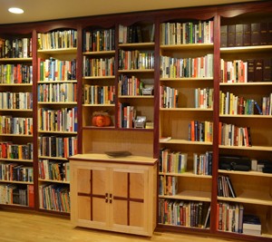 This piece is made from maple ply for all the cases, hardwood maple for the base cabinet counter top and face frame, and purple heart for the trim and face frames of the book cases and CD/DVD rack.