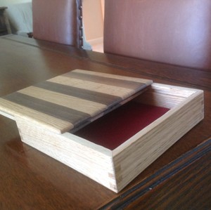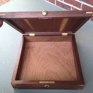 This is a walnut box, 14-1/2 x 14-1/2 with full mortise lock, solid brass hinges and knob.