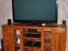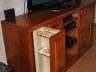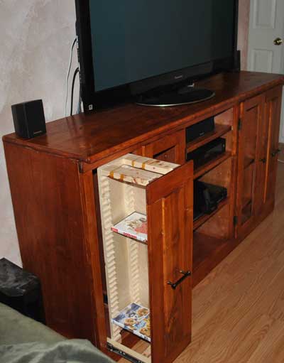 Here is my recent entertainment center project. In these pictures I still have to install the glass into the inner doors. The project is made of 3/4 cherry, with 3/4 birch ply for the case. It was stained with a coat of Minwax Cherry stain and then sealed with 3 coats of amber shellac. The second picture shows one of the DVD storage drawers in the open position. The entire project took me about 3 weeks to complete because I was in a bit of a hurry after buying a new tv and having no where to put it.
