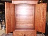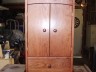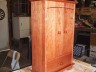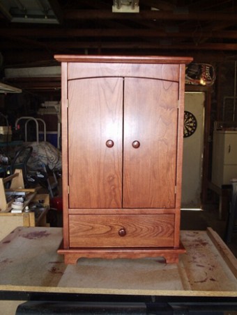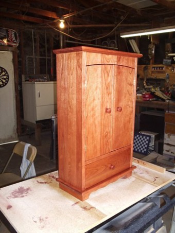 This is a jewelry box I made for my wife for our 16 year anniversary. It is made of solid cherry from the panels of two raised panel cabinet doors that I saved from the trash at a local cabinet shop. To make the back, I cut 2″ strips rather than buying cherry plywood. The hardware came from an old jewelry box that I picked up at a yard sale for $3. I chose not to stain it, so I just used clear laquer, I don’t like to cover up the beauty of the wood when it is this naturally eye-pleasing. If you know where to look there is beautiful wood all around us being thrown away every day. Or at least very cheap.