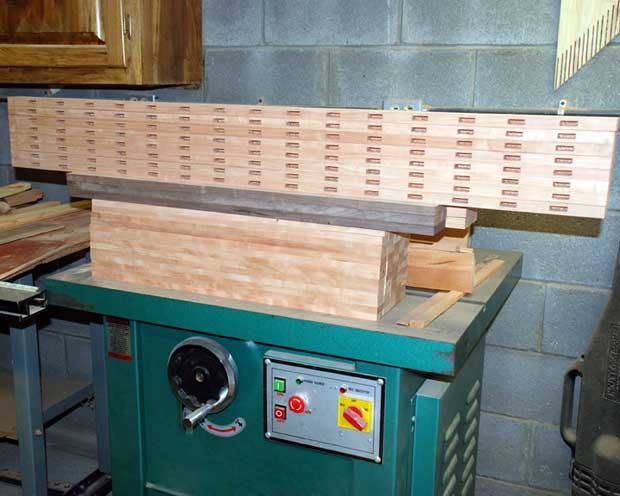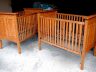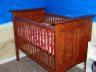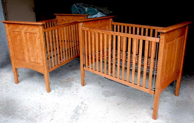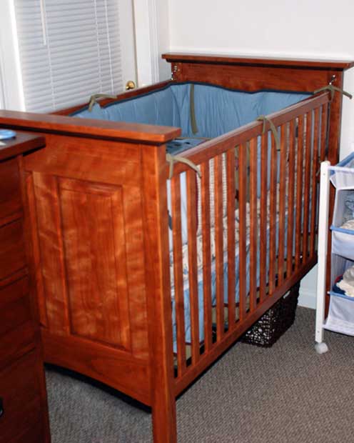 I began the cribs as soon as my wife and I found out we were expecting our first grandchildren, and I attempted to keep them as close to the same as my talent would allow. I ordered the hardware and a set of plans that followed the guidelines set out by the Consumer Product Safety Commission. I followed the dimensions religiously, though I did modify the design to incorporate the raised panel ends. I finished both cribs about two weeks after the births. Yes, I was a little late, but this was my first project using curly cherry, and anyone who has experience with it knows it takes extra time just to keep the jointer and planer knives razor sharp (not to mention the stain and finish!) Additionally, there were 68 mortise and tenon joints in each crib making a total of 136 for the pair.